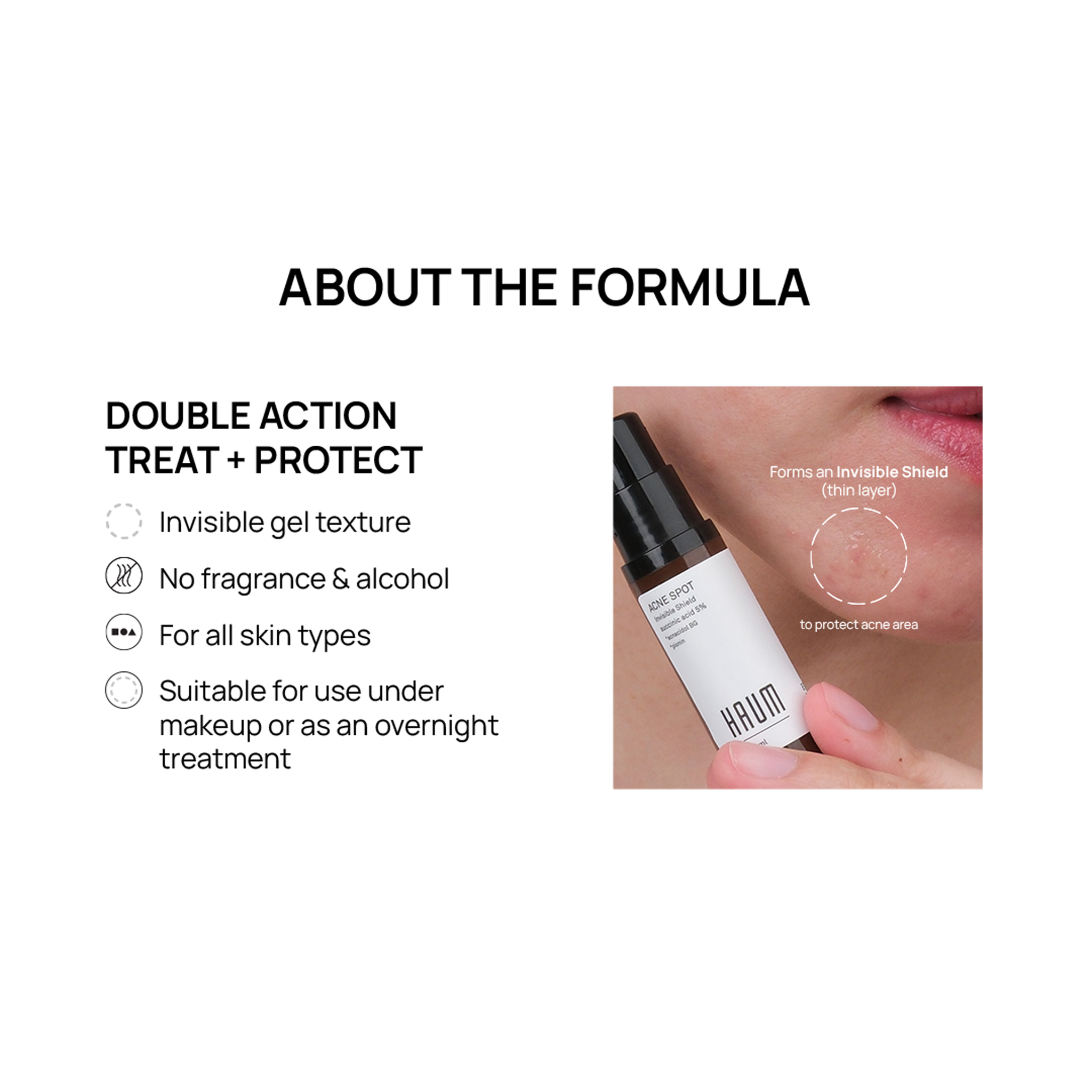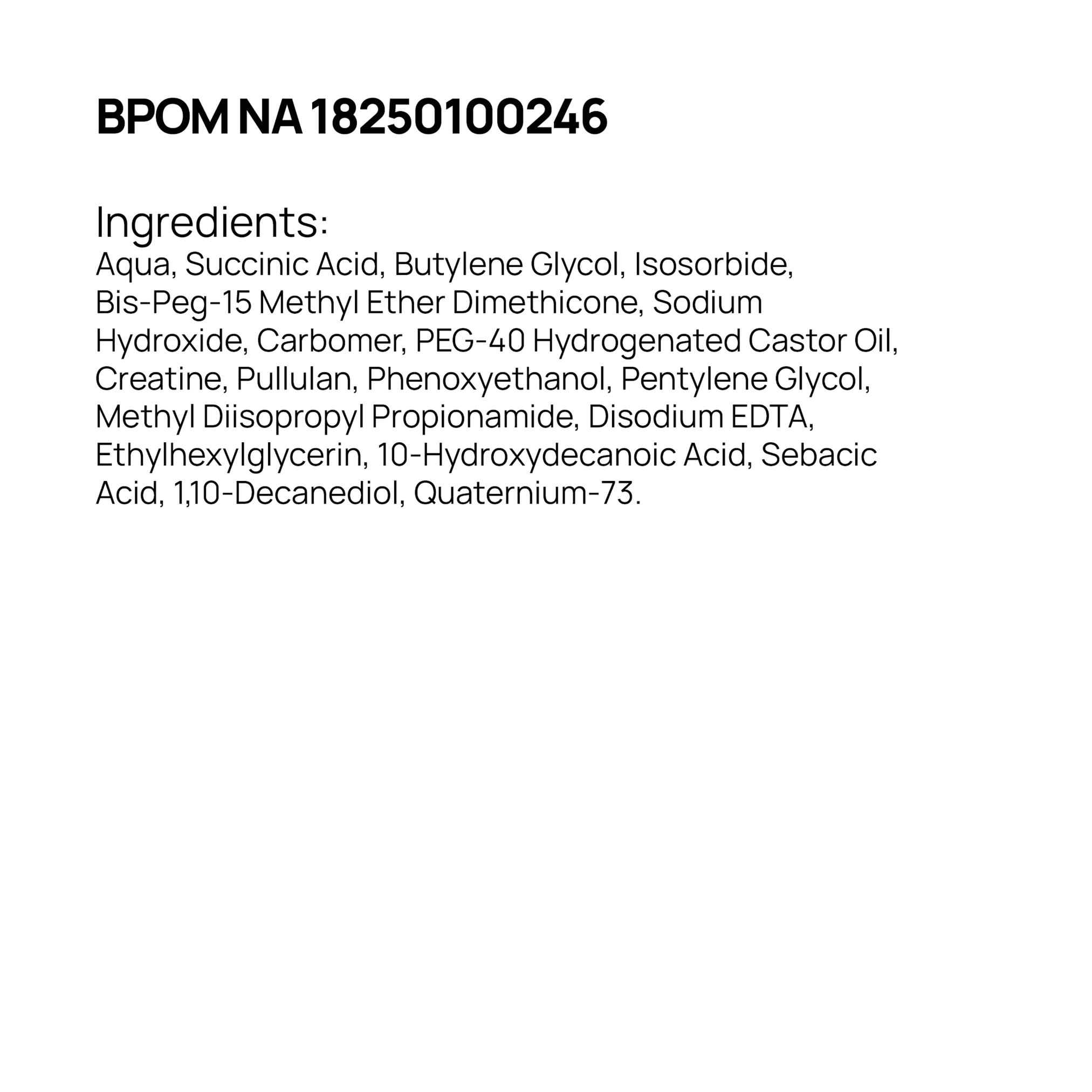 Spot treatment gel dengan Succinic Acid 5% diformulasikan untuk membantu meredakan jerawat dan proteksi dengan membentuk lapisan tipis pada area jerawat aktif, melawan bakteri penyebab jerawat, dilengkapi dengan Acnacidol BG & Pionin.